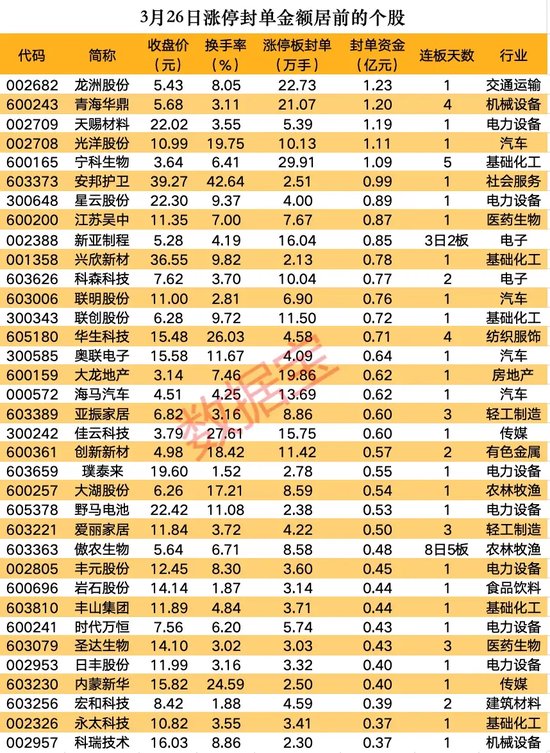 以封单金额计算,5股封单金额超亿元,龙洲股份、青海华鼎、天赐材料封单金额居前,分别为1.23亿元、1.2亿元、1.19亿元。